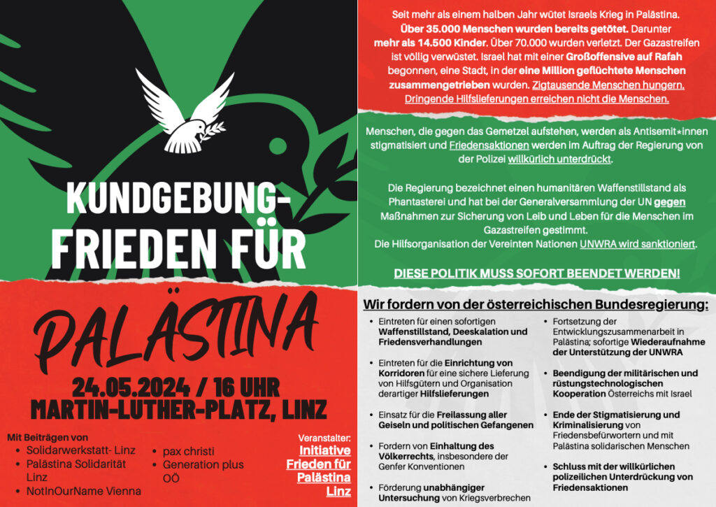 Es gibt viele Gründe, warum Menschen sich Friedensaufrufen anschließen. Einige sind hier, um den palästinensischen Befreiungskampf zu unterstützen; andere wiederum, weil sie angesichts der israelischen Massenmordkampagne gegen Frauen, Kinder und Männer, die in Gaza mit der Komplizenschaft unserer Regierung verübt wird, nicht gleichgültig bleiben können. Einige sind hier, weil sie an das fundamentale moralische Prinzip glauben, dass Gewalt falsch ist und Aggression gegen Gewalt genauso unrecht ist. Manch einer ist besorgt um das Verhalten der österreichischen Regierung rund um den Versuch, die freie Meinungsäußerung und Versammlungsfreiheit einzuschränken. Es gibt einige, die die vorherrschende Doppelmoral nicht länger hinnehmen wollen und der Meinung sind, dass jede Gräueltat und jedes Kriegsverbrechen verurteilt werden sollte, unabhängig davon, wer der Täter oder das Opfer ist. Die Genfer Konvention gilt entweder für alle oder für niemanden. Während unsere Beweggründe unterschiedlich sein mögen, ist unser Ziel doch ein gemeinsames: der Aufruf zu Frieden und Gerechtigkeit für alle Menschen “from the River to the Sea”!