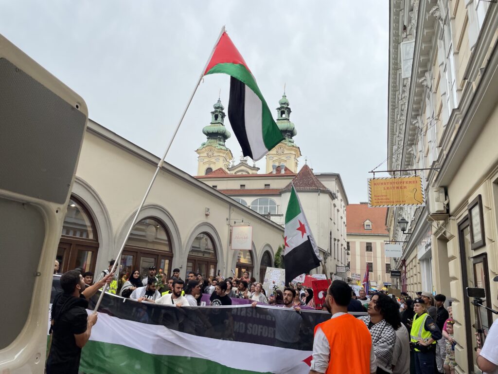Am Samstag, dem 8. Juni, fand eine Demonstration für Palästina in Linz statt. Einige hundert Menschen waren dem Aufruf der Palästina Solidarität Linz und der Students for Palestine Linz gefolgt und marschierten vom Volksgarten durch die Landstraße über eine Zwischenkundgebung im Gedenken an die Märtyrer von Gaza und Westbank, eines Gedenkschweigens und erhobenen Rosen als Symbol für Palästinas Beständigkeit, zum Hauptplatz. Es wurden ein sofortiger und dauerhafter Waffenstillstand, der Boykott Israels und ein Ende der Besatzung mit starker Stimme gefordert. Bei der Auftaktkundgebung wurde klargestellt, dass der acht Monate andauernde Völkermord vor den Augen der Weltöffentlichkeit nicht hinnehmbar ist, im Sinne des „Niemals wieder für alle“ ein Aufstehen und Widerstand erfordert. Ebensowenig hinnehmbar ist die Haltung des offiziellen Österreichs und seiner Regierung, die sich an die Seite des Völkermords stellt, sich einem Waffenstillstand verweigert und die Neutralität verrät, anstatt sich für einen gerechten Frieden unter Einbezug aller Kräfte, auch des palästinensischen Widerstands, einzusetzen. Weil Martin Weinberger (PSÖ) im Angesicht der Polizeiwillkür in ihren wilden Verboten gegenüber der Palästinasolidarität in seiner Rede das Urteil im Namen der Republik des niederösterreichischen Verwaltungsgerichtshofs zitierte, dass „From the river to the sea, Palestine will be free“ dem „Frieden dienen kann“, trat die Polizei an ihn heran und erklärte, dass er nach Paragraph 283 (Verhetzung) angezeigt werde. Es gibt keine Worte für diese unglaubliche Eskalation durch die Polizei, sich über die Justiz einfach hinwegzusetzen und in völliger Missachtung des demokratischen Rechtsstaates schon Zitate und juristische Expertisen zu verfolgen und zu kriminalisieren. Wahrlich „ein Hauch von Polizeidiktatur“ (Astrid Wagner am 6.6. bei der Veranstaltung zur Novelle des NS-Verbotsgesetzes). Ergänzt wird das durch Absurditäten, wie etwa, als einer Journalistin das Betreten der gegenüberliegenden Straßenseite verweigert wurde, weil sie eine Fahne trug. Journalist*innen dürfen keine Fahne tragen, Fahnenträger*innen dürfen sich nicht frei bewegen! Bei der Palästinademo, und nur bei ihr, führte die Polizei dann Lärmmessungen durch, weil die Demonstrant*innen laut waren – schließlich findet ein Völkermord statt, der jetzt gestoppt werden muss! – es ist schon abstrus, dann mit Lärmmessgeräten einherzukommen, um nur ja etwas zu finden, was gegen die Demos herhalten kann. Es ist unsere Aufgabe als palästinasolidarische Bewegung, die Demokratie und die Meinungsfreiheit zu verteidigen und ihre Wiedereinsetzung zu fordern. Genug ist genug! Aus Gaza treffen täglich neue Gräuelnachrichten ein und die österreichische Regierung setzt auf Unterdrückung, statt endlich für einen sofortigen und dauerhaften Waffenstillstand einzutreten. Österreich darf kein Polizeistaat werden.
