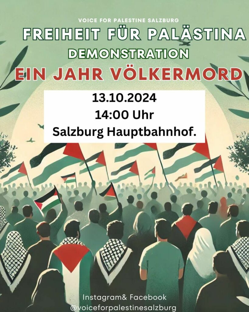 Wir demonstrieren wieder in Salzburg! Seit einem Jahr verübt die israelische Armee einen Völkermord im Gaza-Streifen. Mittlerweile führt Israel auch einen Krieg gegen das libanesische Volk. Österreich steht währenddessen nach wie vor hinter der rechtsextremen israelischen Regierung. Erst kürzlich kam der israelische Parlamentspräsident zu Besuch nach Österreich. Es reicht! Wir werden ein starkes Zeichen für einen gerechten Frieden und ein Ende der Besatzung setzen!