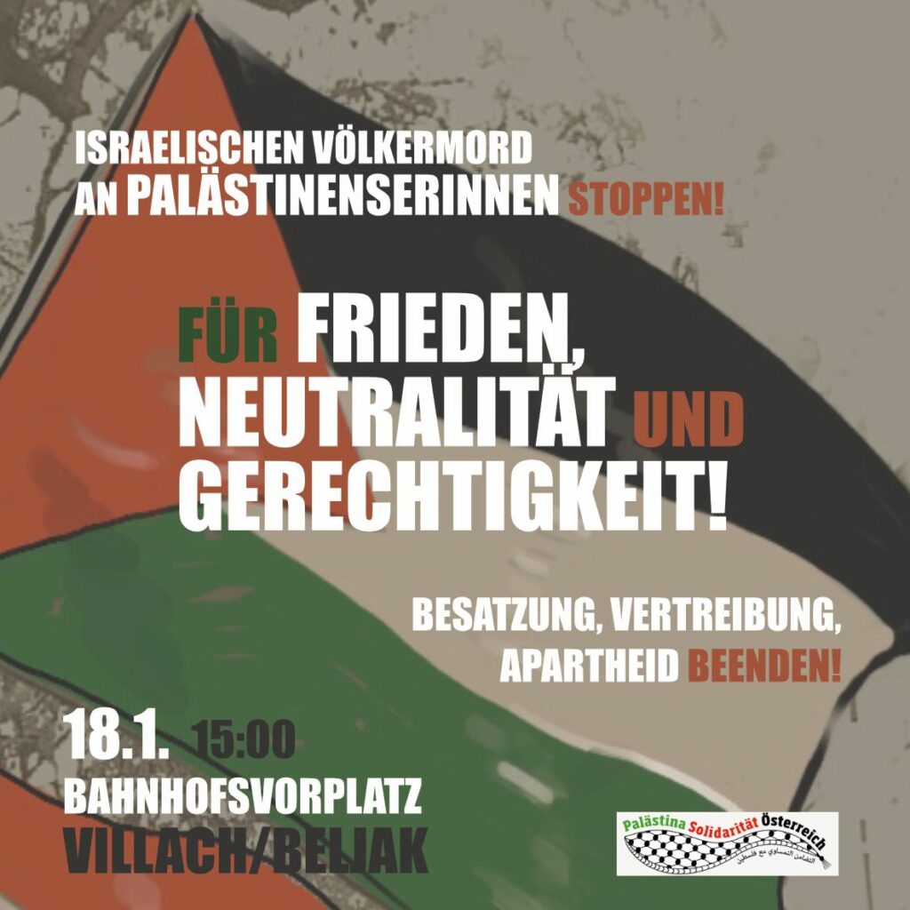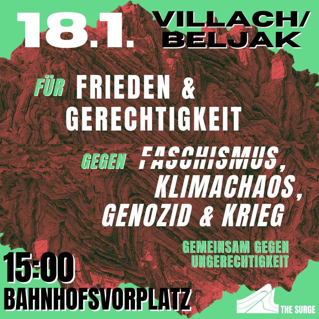 Am 18.01. rufen wir in Villach/Beljak zur Demonstration auf, um gemeinsam ein starkes Zeichen für Frieden, Gerechtigkeit und Solidarität zu setzen. Der Kapitalismus verschärft die globalen Krisen: Faschismus, Klimakatastrophen, Kriege und Genozide sind keine zufälligen Auswüchse, sondern logische Folgen des Systems, das Profite über das Leben stellt.