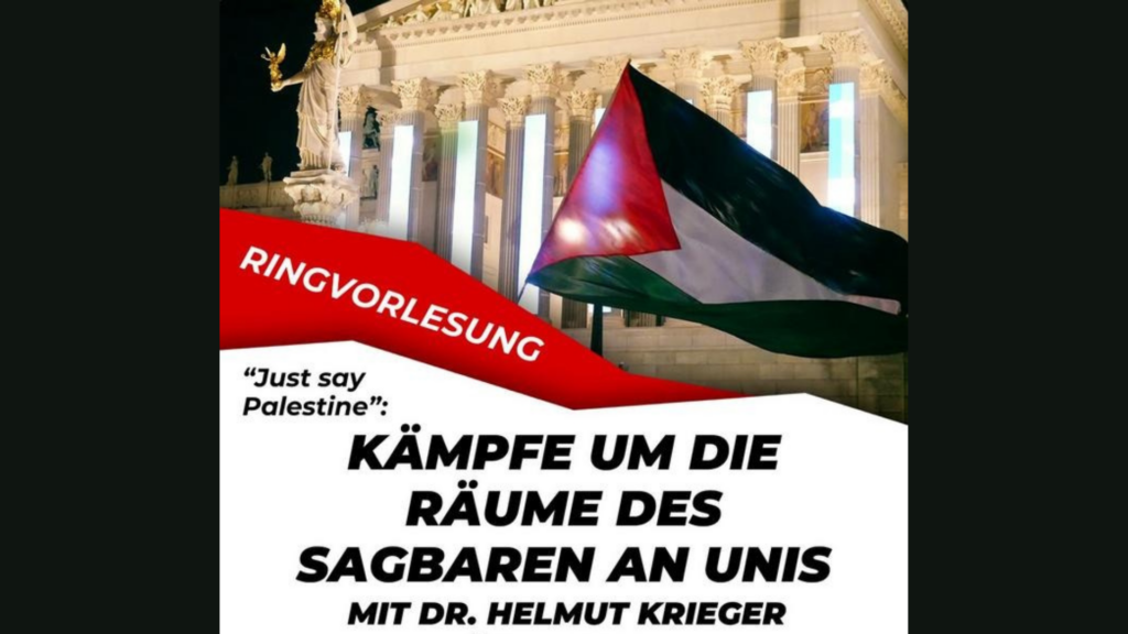 Dr. Krieger unterrichtet und forscht am Institut für Internationale Entwicklung, wo er bereits seit mehreren Jahren Lehrveranstaltungen zu Palästina abhält. Unter anderem ist es ihm zu verdanken, dass letztes Jahr namhafte Größen der Palästinasolidarität ihren Weg als Gastvortragende an die Uni Wien fanden, wie z.B. Rashid Khalidi oder Francesca Albanese. Gleichzeitig hat er auch aus nächster Nähe die Repressionen gegenüber Veranstaltungen wie diesen vonseiten ÖH und Rektorat miterlebt. In seinem Vortrag wird er darüber sprechen.“