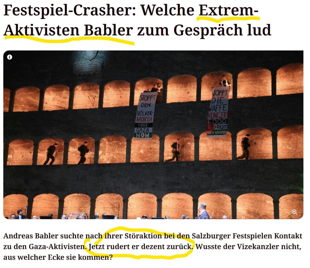 wir bedanken uns für ihr öffentliches Gesprächsangebot als Antwort auf unsere Aktion im Rahmen der Salzburger Festspiele. Wir interpretieren dieses Angebot als Bereitschaft, Ihre Position als Vizekanzler zu nutzen um konkrete Handlungen gegen den andauernden Völkermord, die Besatzungsgewalt in Palästina und die Hungerblockade Gazas zu setzen.