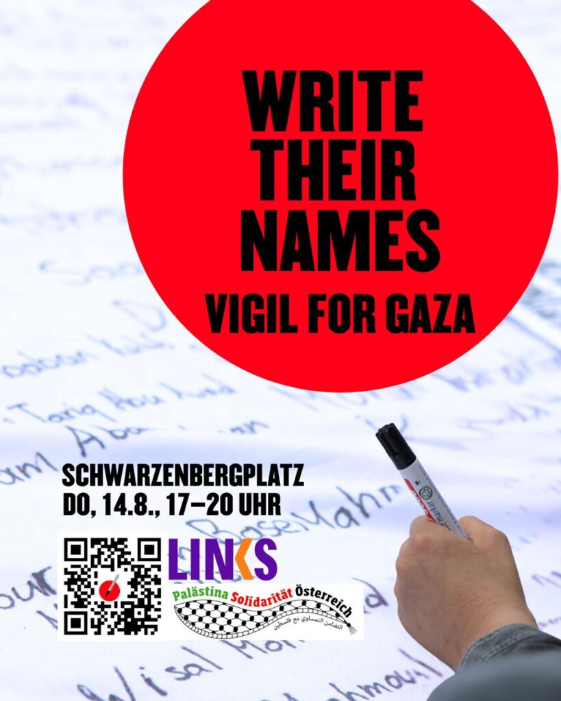 Die nächste Mahnwache gegen den von Israel an den Palästinenser:innen verübten Genozid findet am Donnerstag, dem 14.08., am Schwarzenbergplatz statt: von 17 bis 20 Uhr. Die Mahnwache wird von LINKS und Palästina Solidarität Österreich (PSÖ) veranstaltet.