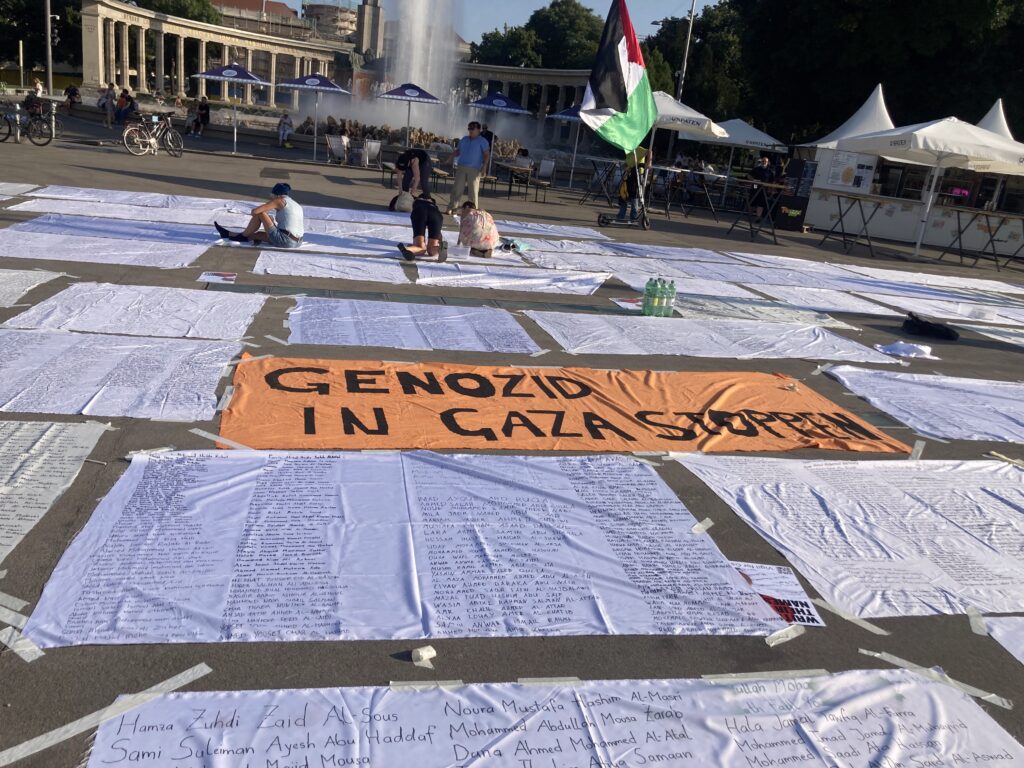 Viele von uns versammeln sich heute bereits zum siebten Mal, um die Namen ermordeter Palästinenser:innen auf weiße Laken zu schreiben. Wir wollen damit ein Zeichen gegen die Tötung, die Vertreibung, das Aushungern sowie die von Israel verübte Folter und sexualisierte Gewalt setzen. Mit unserem Protest wollen wir aber auch Druck auf die österreichische Bundesregierung ausüben, die weiterhin an ihrer Solidarität mit Israel festhält – selbst jetzt, wo eine ganze Bevölkerung ausgehungert wird; wo Menschen, die sich für Essen an sogenannte „Hilfsstellen“ wenden, erschossen werden, wo Israel dabei ist, eine militärische Offensive in Gaza Stadt auszuführen – jener Stadt, die nach mehrfacher Vertreibung für viele der einzige noch mögliche Zufluchtsort ist – und wir den Tod von sechs weiteren Journalisten beklagen, die zum Schweigen gebracht wurden, weil sie der Welt genau diese Verbrechen vor Augen geführt haben.