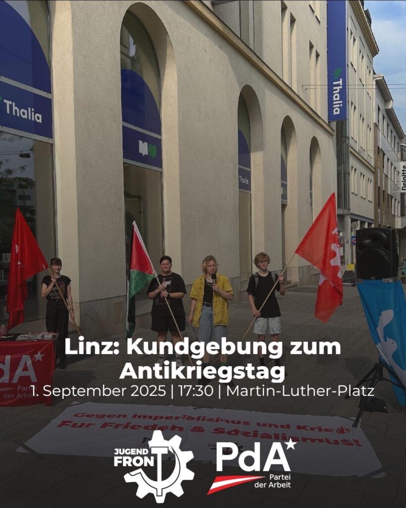 Wir lehnen das ab! Wir wollen eine Welt, die friedensfähig ist, eine Welt jenseits der Kriegstreiber Kapitalismus und Imperialismus. Wir sagen: Wir zahlen nicht für die Kriege der Herrschenden, nicht mit unserem Geld und schon gar nicht mit unseren Leben. Wir fordern eine aktive Neutralitäts- und Friedenspolitik Österreichs, globale Abrüstung und die Auflösung aller Militärbündnisse.