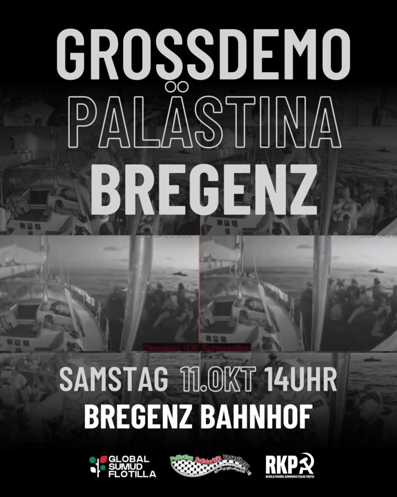 Kommt mit Flaggen und nehmt eure Bekannten mit. In Italien haben 1 Millionen Menschen die Straßen geflutet. Lasst uns der österreichischen Regierung zeigen, dass wir die Mittäterschaft Österreichs im Völkermord nicht einfach hinnehmen und Israel mit der Entführung der Global Sumud Flotilla Aktivisten nicht ungestraft davon kommen lassen werden!