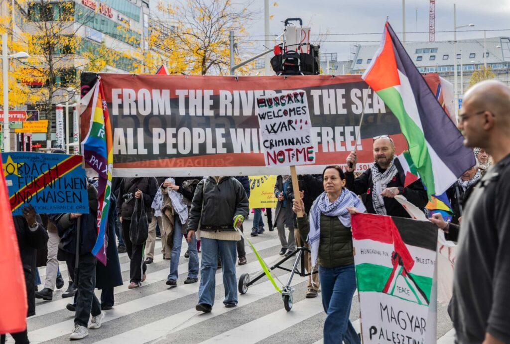Ich war vor zehn Jahren dort, in Budapest, am Bahnhof, wo Syrer geflüchtet sind. Ich habe mit eigenen Augen gesehen, dass sie dort gesessen und geschlafen haben. Sie haben nichts anderes gemacht, außer zu warten, wann sie von euch etwas bekommen oder weiterfahren können. Liebe Regierungen, ihr habt so etwas in eurem Leben nicht erlebt – dass ihr flüchten müsstet. Genauso wenig wünschen Syrer und Palästinenser euch das Gleiche. Es gibt in Ungarn genauso gute und schlechte Menschen, die jemandem etwas antun. In Österreich auch. Das ist nicht schön, und niemand wird dazu stehen. Aber es ist auch nicht erlaubt, dass ihr Waffen und Motoren liefert, damit in Gaza Kinder getötet werden. Wo ist die UN? Wo sind eure menschenrechtlichen Gesetze? Wo habt ihr sie versteckt? Anscheinend braucht ihr sie nicht mehr. Aber sie werden euch bis in euer Schlafzimmer und in eure Träume begleiten.