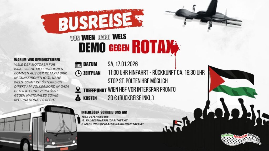 zur Teilnahme an der Kundgebung gegen die Lieferung österreichischer Mororen für Killer-Drohnen an den Völkermord-Staat