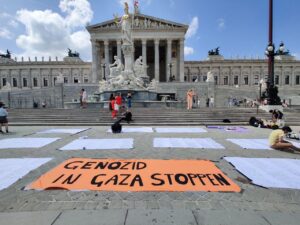 Wien 11.7.2025 – Im Rahmen der 39. Sitzung des Nationalrats am 11. Juli, bei der die humani-täre Lage im Gazastreifen thematisiert wurde, intervenierten Aktivist:innen der Palästina Solidarität Österreich. Mit Bannern, Flugblättern und Sprechchören forderten sie politische und wirtschaftliche Sanktionen gegen Israels Völkermord.