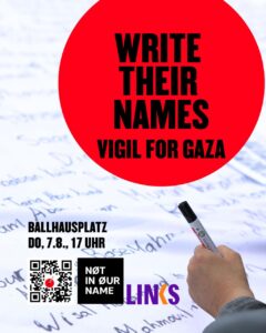 Unter dem Motto "Write Their Names" schreiben wir die Namen getöteter Palästinenser:innen auf weiße Laken. Wir wollen damit ein Zeichen gegen das Töten, Aushungern und Vertreiben der Palästinenser:innen setzen und Druck auf die österreichische Bundesregierung ausüben, die an der Solidarität mit Israel festhält, selbst jetzt noch, wo in Gaza Hunderttausenden Menschen akut der Hungertod droht und Netanjahu eine vollständige Besetzung des Gazastreifens angekü ...