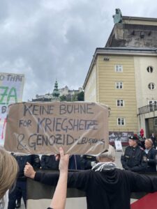 Gemeinsame Erklärung der jüdischen Aktivisten, die die Eröffnung der Salzburger Festspiele stören und Not In Our Name Vienna (NION) „Wir würden gerne Ihren Rücktritt fordern, aber leider vertritt die IKG nicht uns Juden, die kategorisch ablehnen, was Israel dem palästinensischen Volk antut.“ NION wurde unter anderem gegründet, um jüdische Stimmen in Österreich zu vertreten, die sich nicht v ...