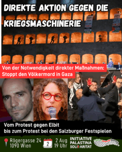 Aufruf an Salzburgs KP-Vize-Bürgermeister Die Aktion der Aktivist:innen bei den Salzburger Festspielen hat gezeigt, dass es möglich ist, das Schweigen der politischen Öffentlichkeit zum Völkermord in Gaza zu brechen. Die Reaktionen auf die gelungene Störaktion zeugen von einem gesellschaftlichen Umschwung. Viele Menschen in Österreich wollen die proisraelische Haltung der Bundesregierung und d ...