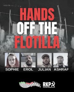 Der verbrecherische Angriff gegen die Global Sumud Flotilla darf nicht hingenommen werden. Wir rufen alle Menschen auf, auf die Straße zu gehen, sich in Solidarität zu versammeln, zu demonstrieren und an der Flotilla Support Demo teilzunehmen!