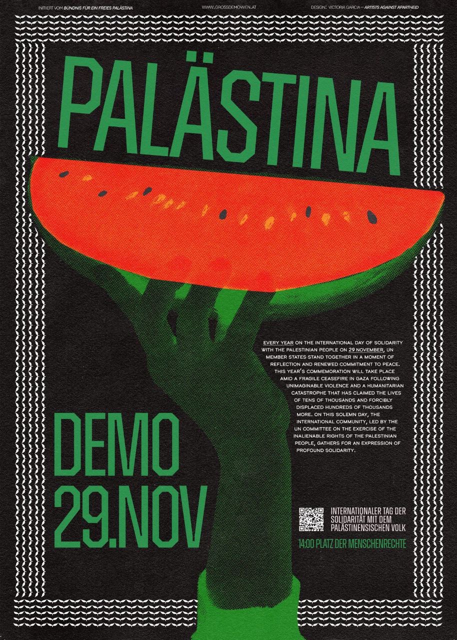 Wien: Palästina-Demo 29. November ! 14 Uhr am Platz der Menschenrechte, 1070 Wien Zum "Internationalen Tag der Solidarität mit dem palästinensischen Volk": Frieden braucht Gerechtigkeit – Schluss mit der Besatzung! ...