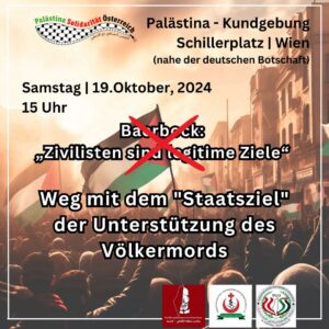 JA zur Neutralität! NEIN zu Sky-Shield! NEIN zu einer EU-Kriegstruppe!Völkermord in Palästina stoppen!Aufruf zur Kundgebung: am 26. Oktober 2024 in Wien 13h Maria-Theresien-Platz (organisiert von der Solidarwerkstatt Österreich)16h Parlament (verschiedene Gruppen der Friedens- und Neutralitätsbewegung) Seit mehr als einem Jahr wütet die israelische Armee im Gaza-Streifen und begeht, unterst ...