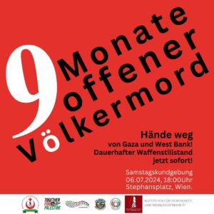 Wir sehen uns am Samstag, 13.07.2024, um 18 Uhr am Stephansplatz! Am nächsten Samstag sind es 281 Tage, mehr als NEUN MONATE, dass das israelische Regime seine schon über sieben Jahrzehnte bestehenden illegalen Maßnahmen und Verbrechen gegen das palästinensische Volk zum offenen Völkermord intensiviert hat. ☠☠☠ Das tut das israelische Regime unverschämt, unbestraft und ohne Sanktionen. Dazu genießt es die deutliche Unterstützung der österreich ...