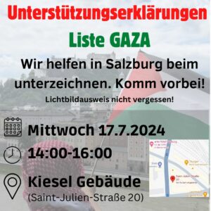 Gegen den Völkermord, für die Neutralität Österreichs An die 650 Unterstützungserklärungen wurden bisher für die Liste GAZA in Wien abgegeben. Mehr als 550 davon halten wir in Händen. Daher bereiten wir die Einbringung unseres Wahlvorschlags „Liste GAZA – Stimmen gegen den Völkermord“ in Wien vor. Damit ist die erste große, ja größte Hürde (fast) überwunden. Noch mehr: der eigentliche Zweck der Liste GAZA ist schon im Ansatz erfüllt – nämlich die ...